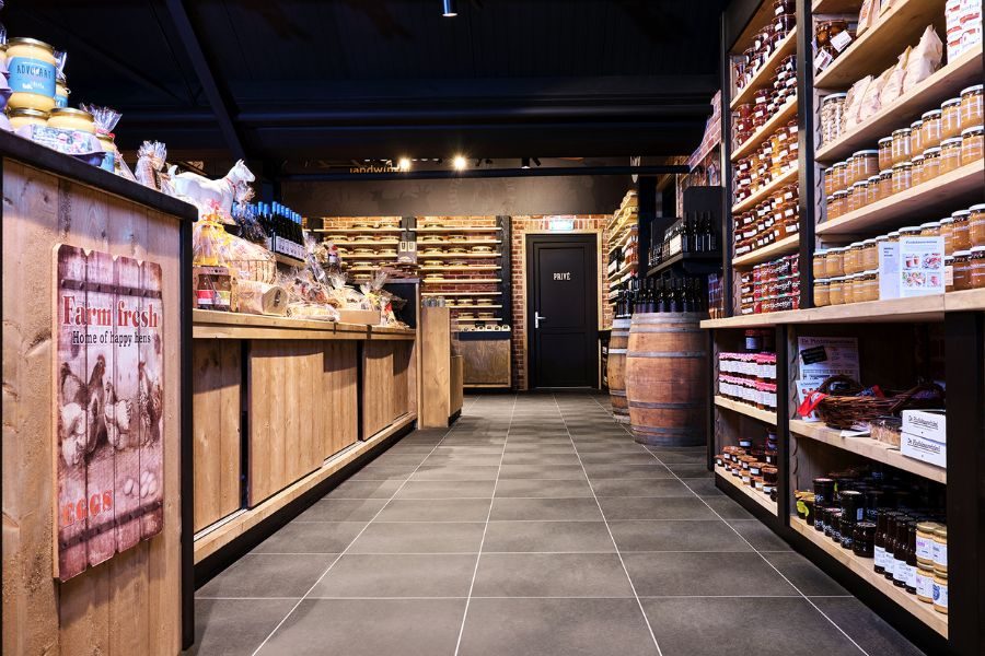 In de winkel van De Mèkkerstee hebben wij de Veka Original™ vloerafwerking gelegd in de kleur antraciet. De vloer is afgewerkt met witte lasdraad, rechte plinten, oplopen en een RVS vloerput. Een duurzame en hygiënische oplossing die perfect aansluit bij de dagelijkse praktijk in een drukbezochte winkelomgeving.